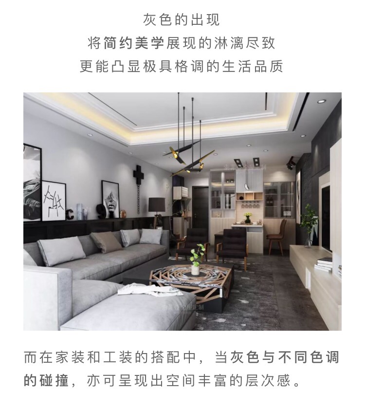 作為百搭色,灰色可謂是“安全牌”。即使你不是專業設計師,也能將灰色搭出大師級水平,空間搭配和諧,體現高級感。