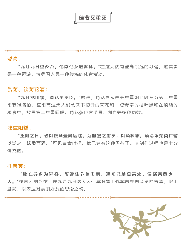 每年的農歷九月初九為重陽節。九九重陽,九在數字中有生命長久,健康長壽的寓意,所以重陽節又被稱為“老人節”。