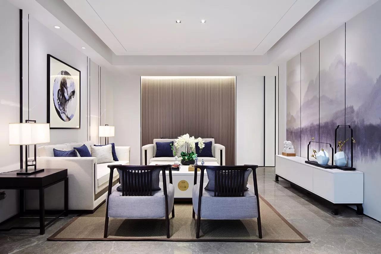 隱約的水墨背景與兩側的金屬屏風,構成虛與實,疏與密的哲學均衡美,茶幾大理石的紋路自然演繹了一幅自然山水之美,賦予空間綿綿不盡的詩意想象。沒有任何顯著的東方符號堆砌,言有盡,意無聲,卻自始至終浸透著東方特有的禪思靜謐。