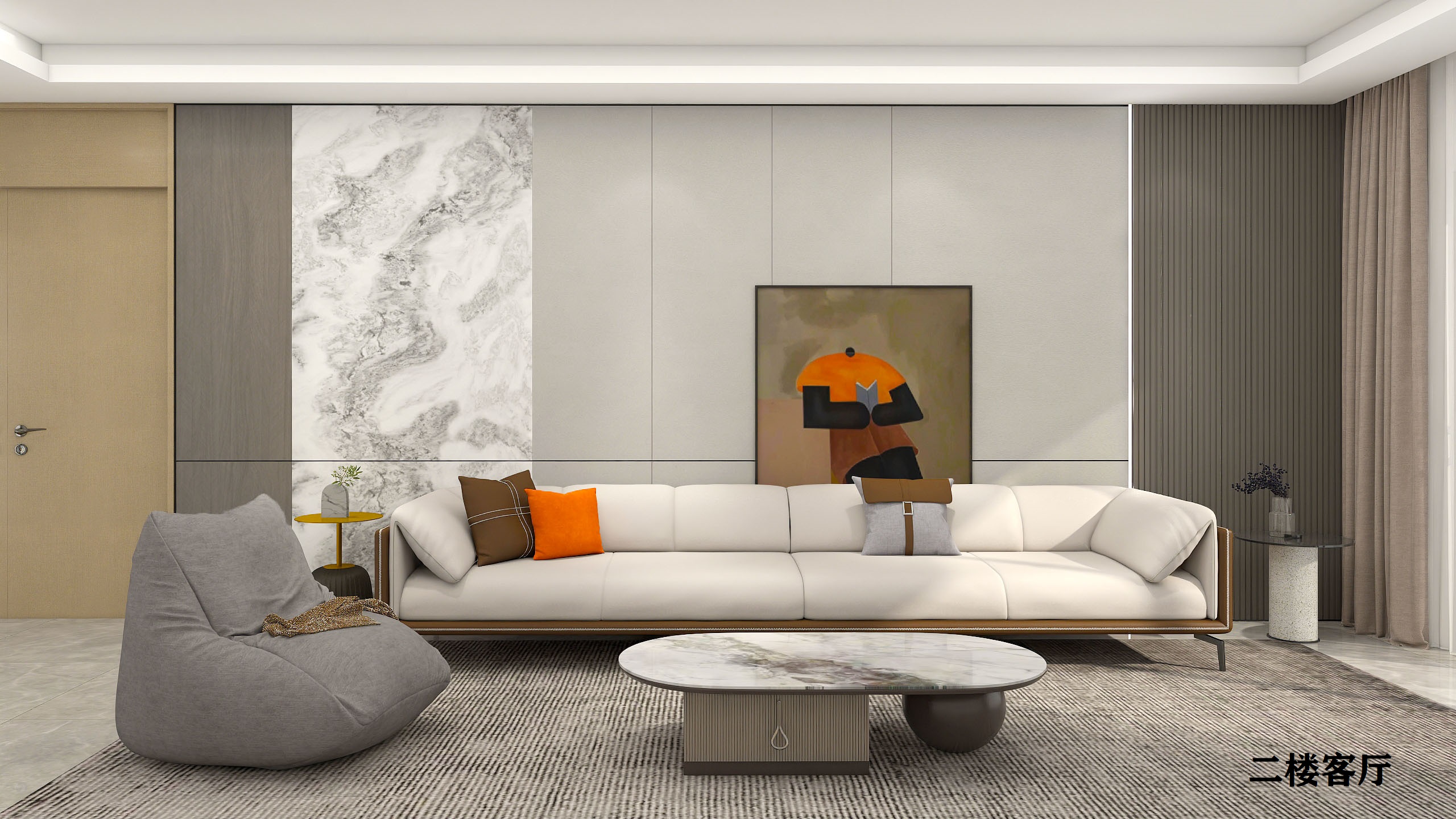 褪去繁雜的造型,簡單的線條臨摹出存粹的的休息環境,細絲尤加木紋色墻板拼接石紋打印畫,糅雜木質的溫潤與大理石的堅毅,打造多層次的空間感官。自然灰調的莫蘭迪色,正居墻面中間,低飽和度的莫蘭迪色既不會太張揚也不會過于平淡,旁邊巧妙的運用格柵設計點綴細節,就可以輕松提高空間檔次。