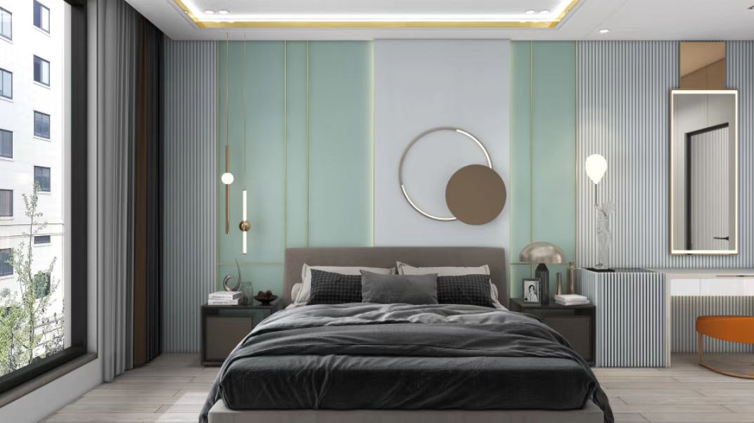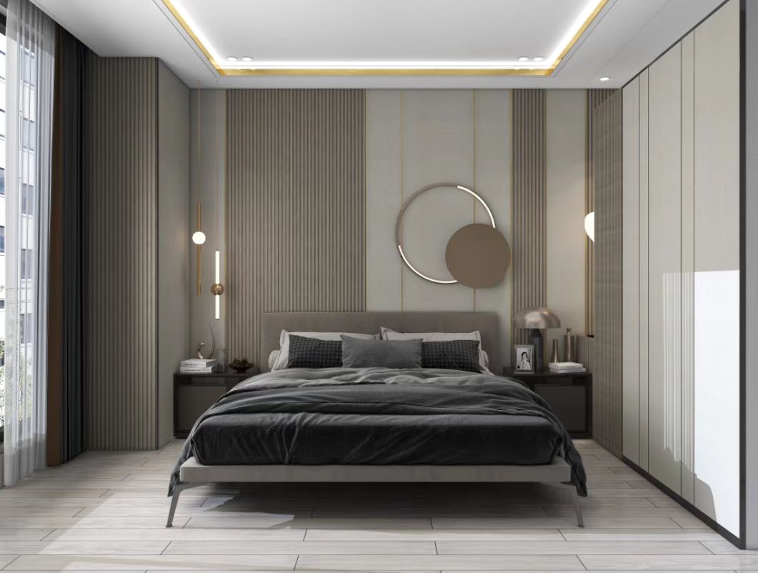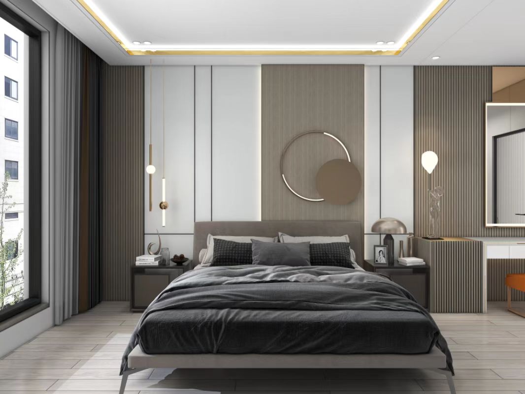 臥室背景墻使用客廳同款木紋飾面搭配布紋系列中的莫蘭迪色。集成墻板布紋紋理和木紋紋理的結合,結構簡潔富有層次感,讓空間整體充滿溫馨雅致的氛圍感。