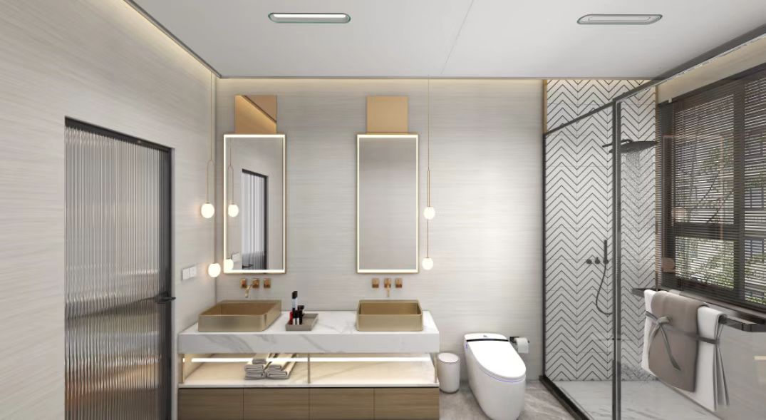 衛生間做的干濕分離設計,日常使用起來安全、高效、衛生。墻面用的是環保水性木紋系列中的水性麥金利楓木色集成墻板,防水防潮易清理,功能顏值具備。