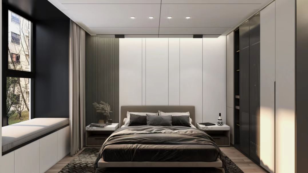 沉穩的魚骨紋格柵搭配絲絨布紋墻板與明亮的白色頂面相互呼應,營造出簡約時尚的氛圍。進入臥室,仿佛一切煩憂都被褪去,心情都會變得輕松愉悅。