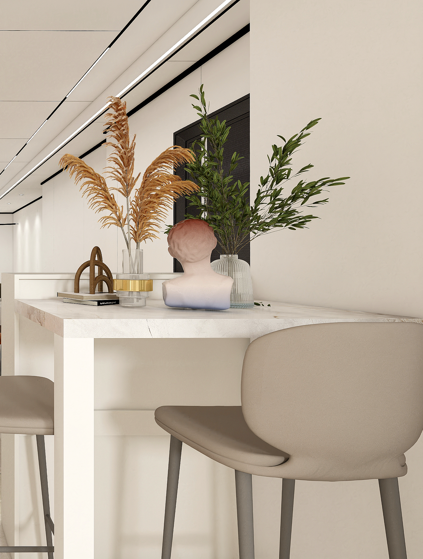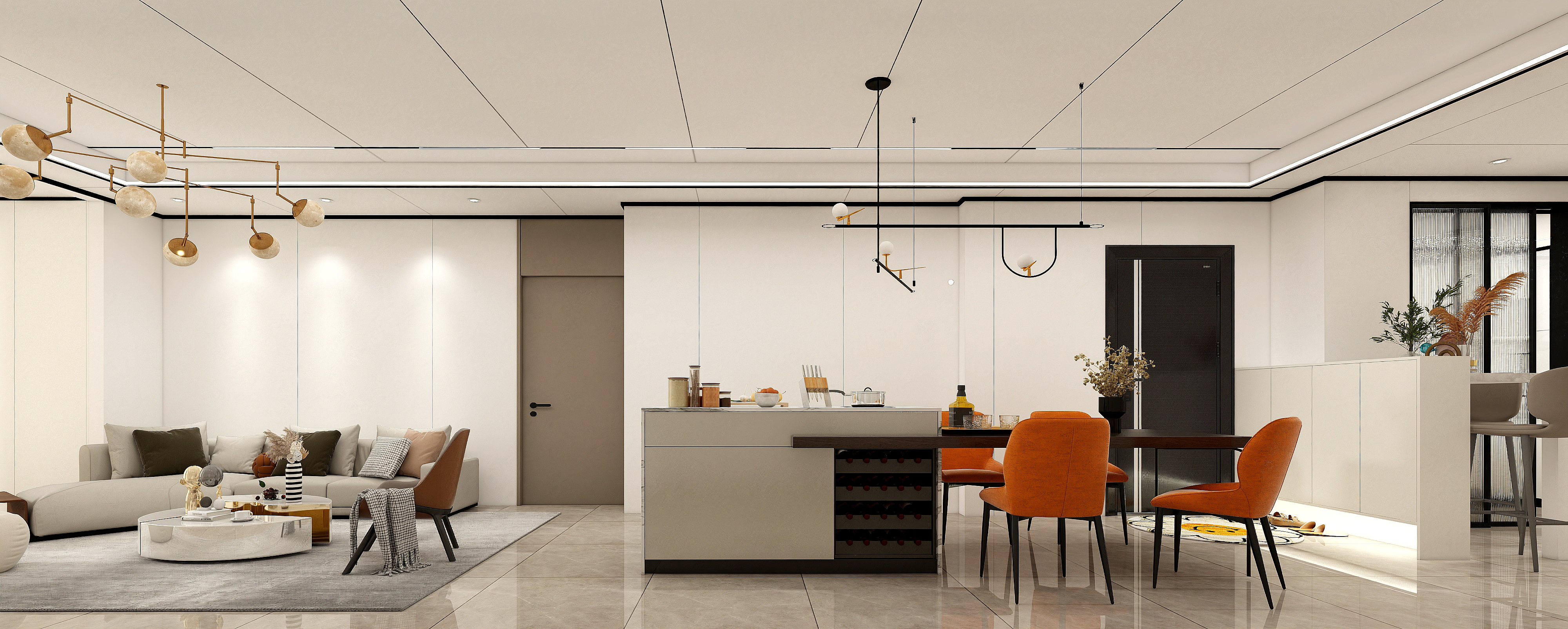 進深感絕佳的大豎廳,以島臺+餐桌柔和劃分空間,通過材質、顏色、燈光的細微變化,制造出空間層次視覺。