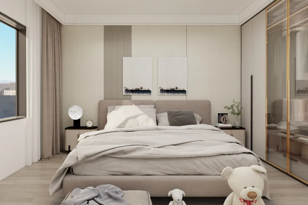 主臥,空間寬敞通透,環保水性布紋系列裝配式墻板,與膚感米咖格柵拼接加深層次感,側面定制衣柜,滿足基本收納需求,不同材質之間的相互碰撞,增加空間的層次感與延展性。