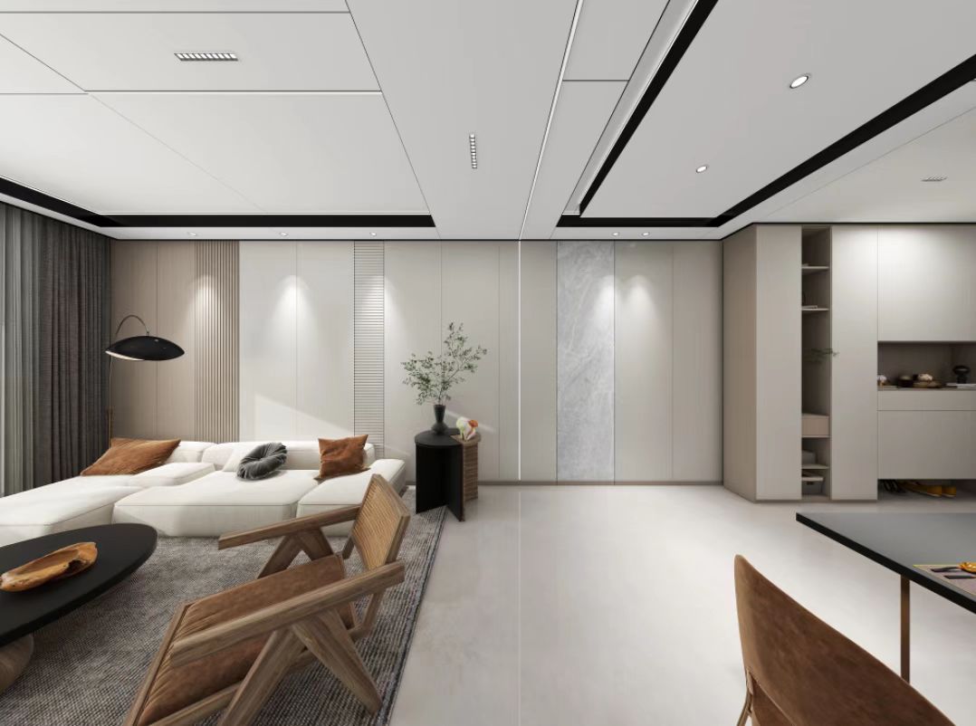 超長的大豎廳,布置米色主體沙發,背景墻以星優木板子午灰搭配加拿大淺色胡桃,點綴大理石紋墻板,層次感與高級感撲面而來。