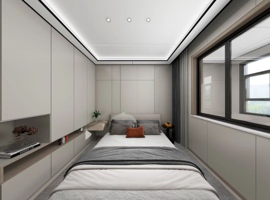 次臥整體延色彩和諧統一,無主燈設計,陽光透過窗戶進入室內,氛圍舒適自然。