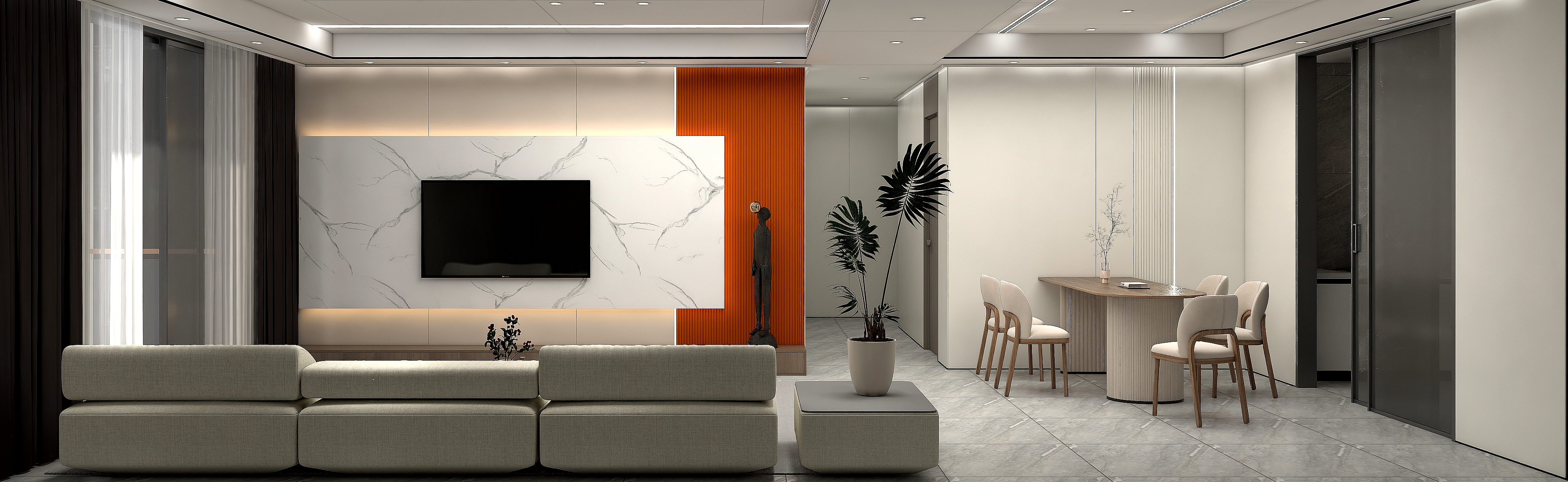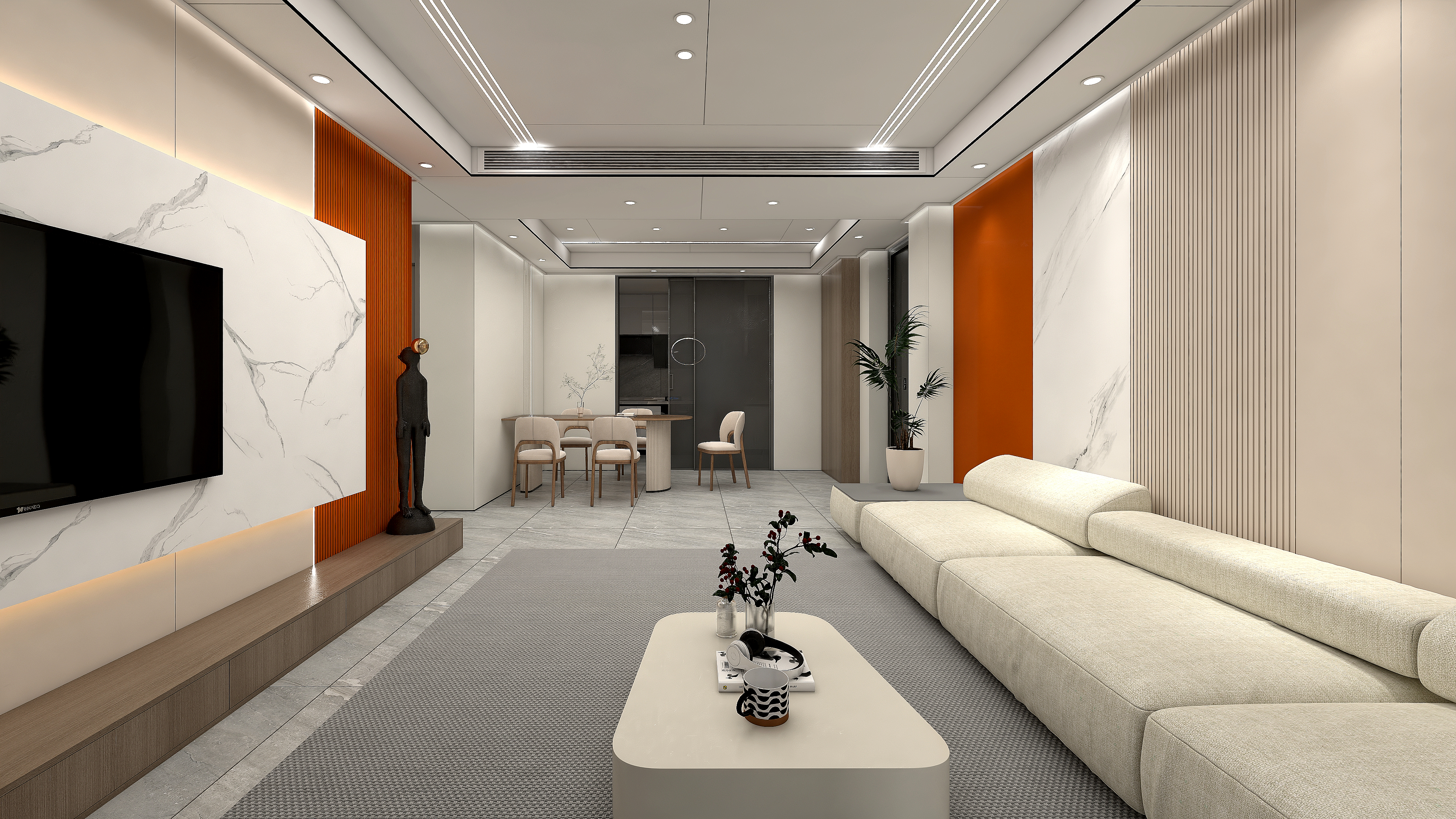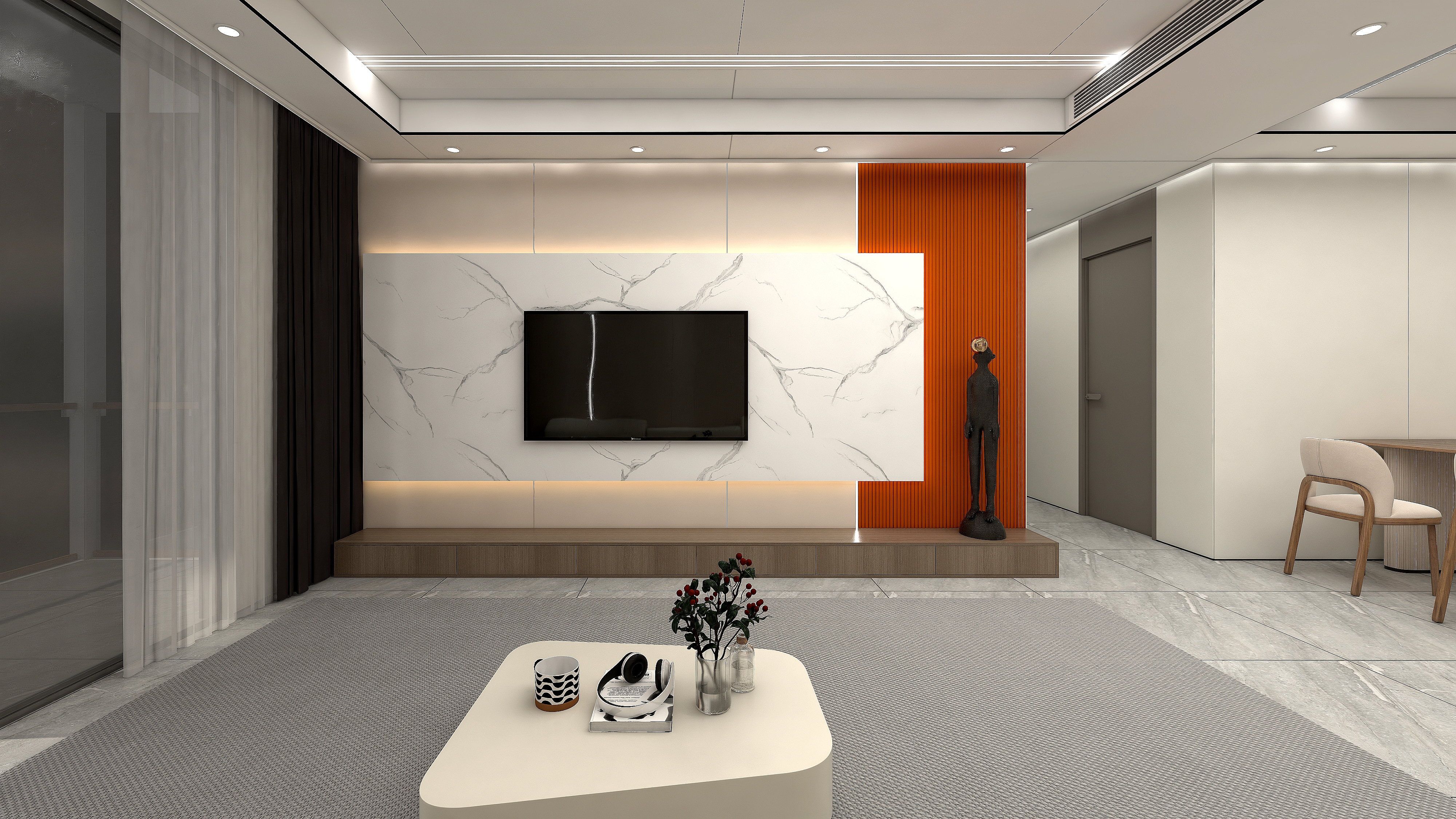 空間和材質(zhì)的完美融合,膚感米咖搭配3D石紋打印畫打造的懸浮電視背景墻,愛馬仕橙的配色點亮沉悶的空間。
