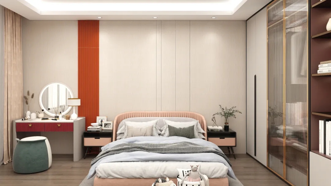 柔和的現(xiàn)代風(fēng)帶著一抹愛馬仕橙的暖調(diào),與客廳空間相互呼應(yīng)的線條設(shè)計帶著和諧的美感,營造了一個盡顯溫馨治愈的睡意空間。
